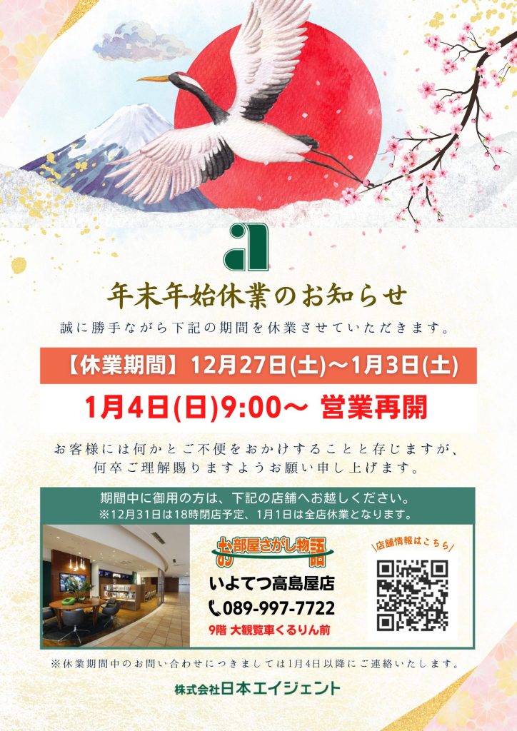 【休業期間】12月27日(土)~1月3日(土)